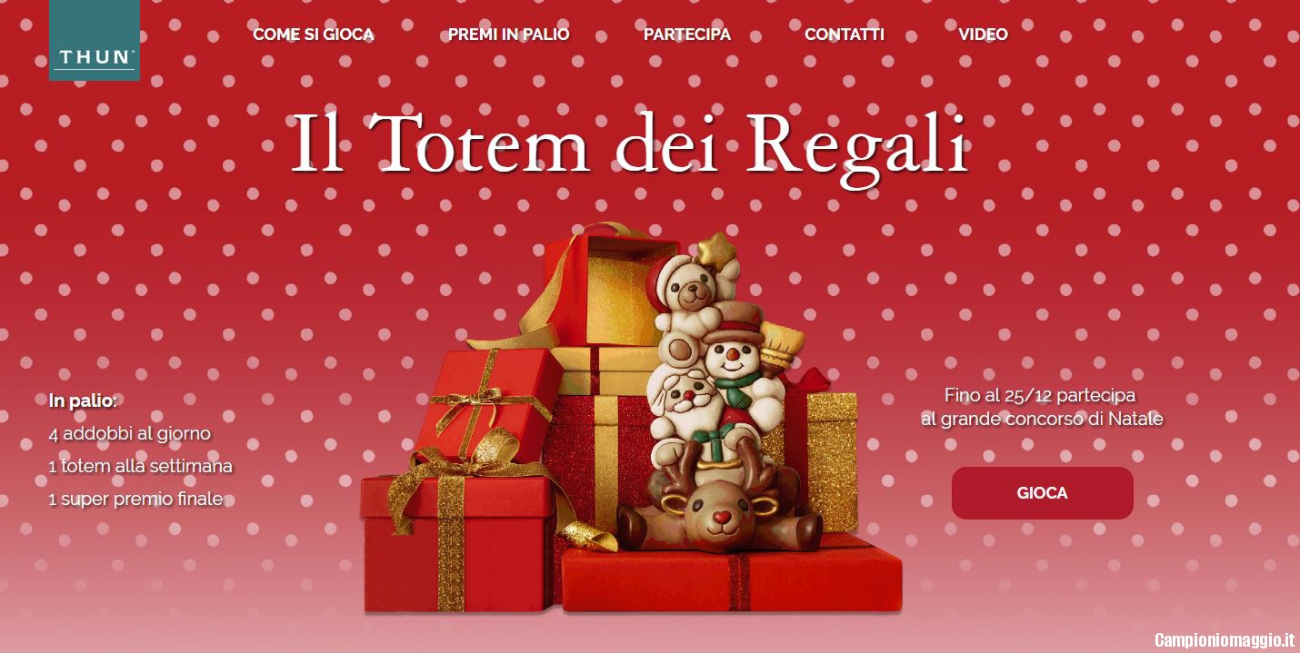 28 novembre 2017 28 novembre 2017 admin 1 commento natale thun. Concorso di natale thun il totem dei regali. Dal 27 novembre al 25 dicembre 2017 registrati gratuitamente sul sito ufficiale thun per partecipare al grande concorso di natale e provare a vincere meravigliosi addobbi natalizi e ad estrazione finale una thun experience a bolzano. Concorsi a premi concorsi gratis featured vincere viaggi crociere e weekend.