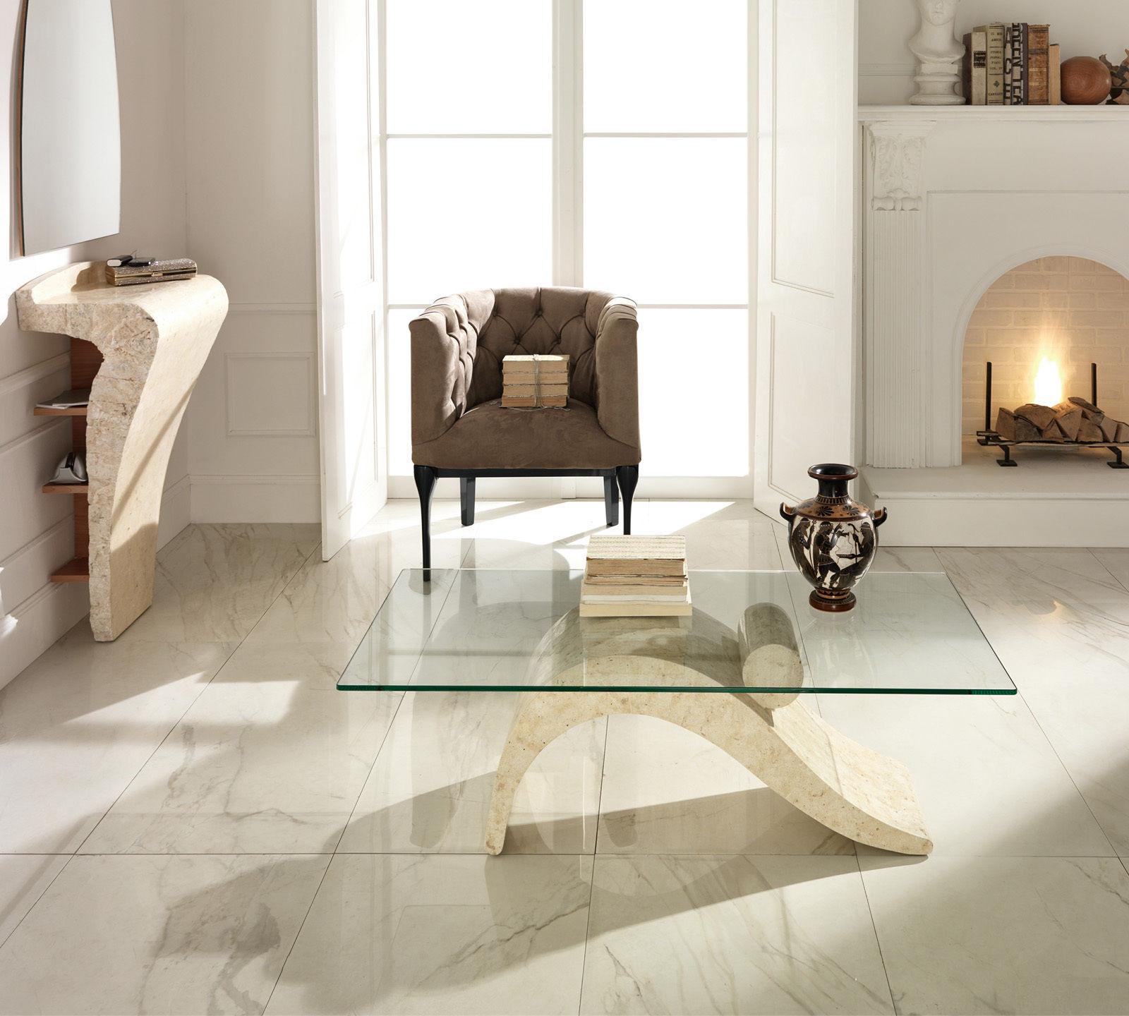 Pensaci se hai bambini piccoli inclini alle arti plastiche. Tavolino da caffè con base in pietra fossile e piano in vetro polifemo. Bianco mactan bianco grey stone grigio. 896 00 35 578 00.